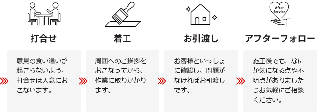 常に「お客様第一」の姿勢を大切にし、ご相談から施工、アフターフォローまで一つひとつ丁寧に対応いたします。